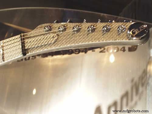 La guitare présente une finition en fibre de carbone argentée avec une touche laminée en carbone argenté. Il a également des incrustations de carbone turquoise et des détails gravés au laser pour le 10e anniversaire avec une plaque de numéro de série.